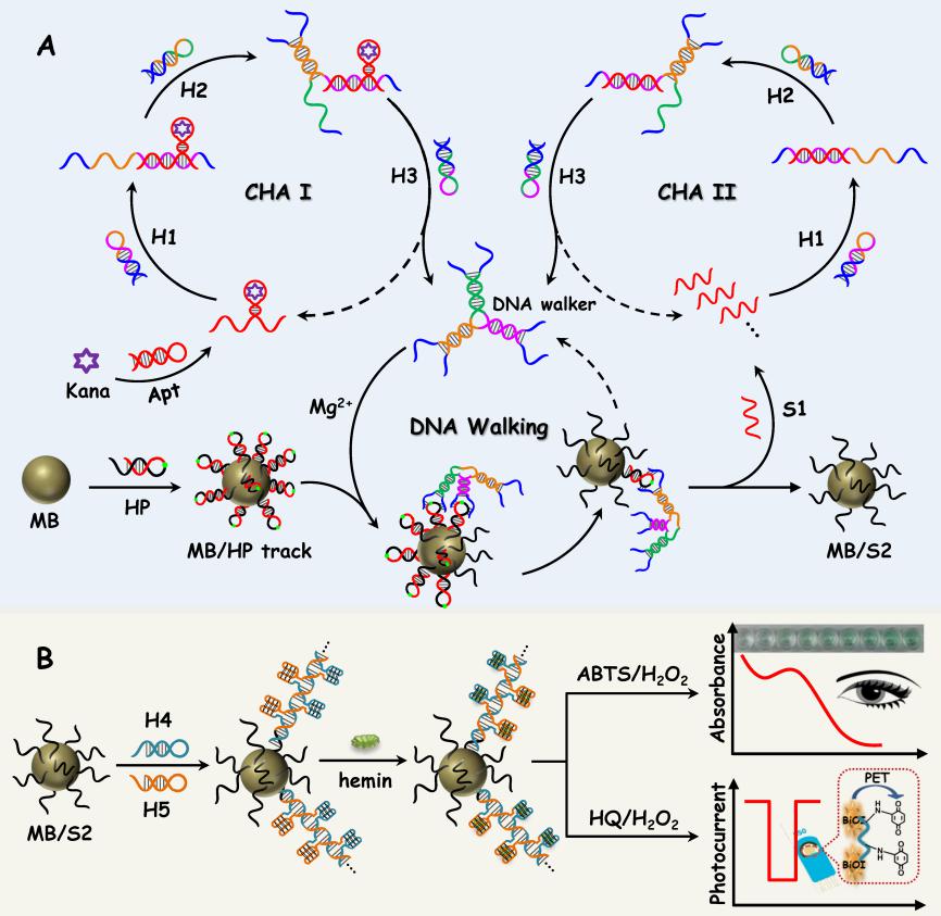 DNA步行机近年来逐渐被人们用作一类有力的生物传感信号放大工具,然而如何采用合适的策略来增强其信号放大效率目前仍然面临着重要挑战。在本工作中,赖国松教授研究组设计了一种双重催化发夹组装(CHA)策略来高效构建一种三足镁离子核酸酶(MNAzyme)驱动的DNA步行机,并在此基础上成功发展一种可用于卡那霉素(Kana)抗生素检测的双模式生物传感新方法。如下图所示,第一重CHA循环反应由目标分析物的高特异性核酸适配体识别反应来触发;第二重CHA循环反应由DNA步行机在构建的三维磁珠(MB)步行轨道上的智能步行引起的“伪目标物”S1释放而触发。通过上述DNA步行产物来进一步引发MB表面通过杂交链反应(HCR)来定量组装形成大量富含G四链体DNA酶(G-DNAzyme)的双链DNA,即可利用G-DNAzyme的模拟酶催化性质方便构建该方法的比色及光电化学双模式信号转导策略。由于双重CHA循环反应对该三足三维DNA步行信号放大的极大促进作用,以及HCR组装G-DNAzyme的协同信号放大,该方法具有很高的分析灵敏度。同时,基于巧妙核酸设计的该生物传感方法还具有很好的选择性和重复性,成本低廉,无需采用复杂的仪器装置及传统色谱或异相生物传感中的复杂操作,而且还不存在蛋白质核酸酶催化体系中较高的背景信号影响,因而有望在食品或环境等复杂样品中抗生素残留的简单筛查及自动化准确检测领域发挥重要应用价值。