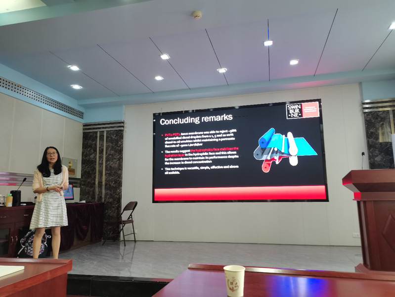 报告中,俞教授首先介绍了当前所研究的主要方向,包括材料应用、生物医学应用、环境应用和能源等方面。然后从乳液污染来源、膜技术用于乳液分离、Janus膜的设计和制造以及Janus膜用于油水分离等方面介绍团队取得的研究成果。其中,Janus膜具有疏水的一面,当水从亲水性一侧渗透到疏水性一侧时,表现出显著的背压;由静电纺丝制备的Janus膜是采用氧化诱导聚多巴胺涂层进行修饰,充分利用了聚多巴胺优良的粘附性和亲水性。研究结果表明,Janus膜能够在保持较高渗透通量的同时,获得较好的乳液分离效果。最后,俞教授还介绍了澳大利亚斯维本科技大学的校园环境、科研条件和奖学金政策,鼓励公司本科生和研究生出国交流深造。