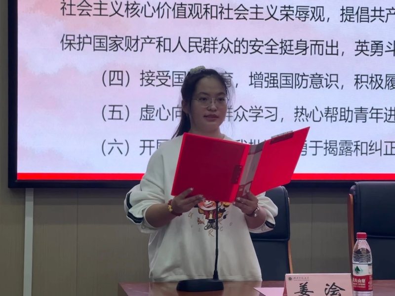 接着各姜诚、吴天真分别为新团员颁发团员证,佩戴团徽。佩戴完毕,由姜诚老师领誓,全体团员右手握拳,面向团旗庄严宣誓,时刻谨记作为一名共青团员的权利和义务,真正做好中国共产党的助手和后备军,在强国建设、民族复兴伟业中挺膺担当。