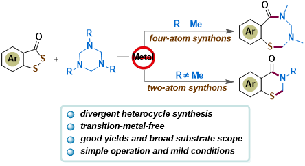 由于含硫杂环化合物在生物活性天然产物、药物分子和功能材料中的重要应用,含硫杂环的构建在合成化学领域受到了广泛关注。相比于构建五元和六元硫杂环化合物,含硫中环化合物的合成由于存在着不利的熵效应和跨环张力,构建含硫中环化合物更具有挑战性。因此,开发简单绿色的合成路线实现含硫中环化合物的高效构筑一直是有机合成化学的研究目标之一。基于此,K1体育 - 十年品牌周耀博士研究团队报道了无金属条件下取代基控制的苯并二磺酚酮与六氢-1,3,5-三嗪化合物发散环化反应,利用六氢-1,3,5-三嗪化合物作为四元/二元合成子,在温和的条件下,合成一系列八元环化合物和六元环化合物。