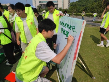 随后,参会的同学在“低碳生活我先行”的主题宣传墙签名,表明了湖师青年心怀环保、行为环保,共同营造美丽的环境、共创绿色生态校园的决心。活动最后,大家一同对篮球场及周边环境进行了打扫。