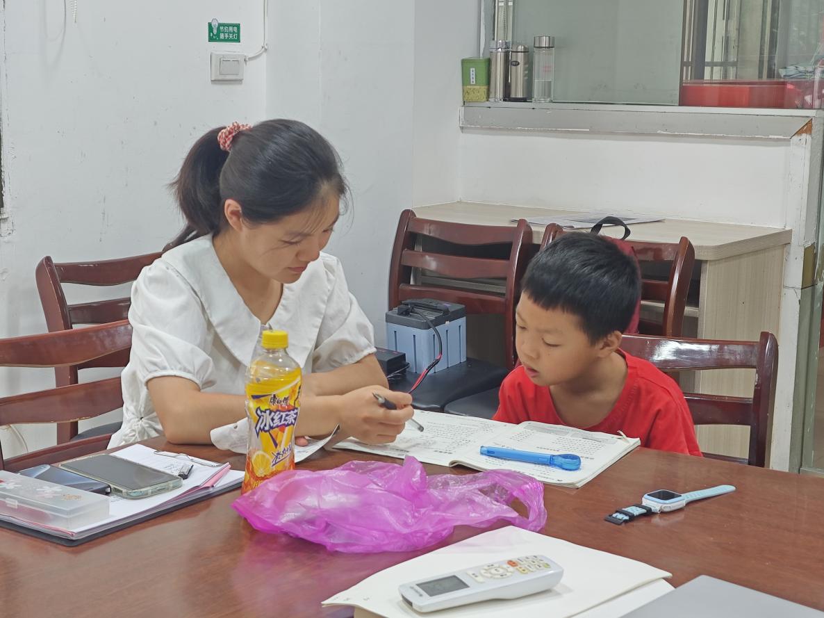 蝉鸣悄起,暑日已至。暑假是孩子们巩固知识、提升能力的重要时期。为了帮助孩子们更好地利用暑假进行学习,完成暑假作业,老员工志愿者们以一对一的形式进行辅导,团队成员们发挥自己的特长,对孩子们的语文、数学、英语等学科暑期作业进行课业辅导,耐心询问他们在学习上遇到的困难和问题,并一一进行解答。实践队员化身“小家教”,点燃孩子们的学习热情,带领孩子们查缺补漏、探索新知。员工们积极提出自己在作业上的疑问,队员们有针对性地进行指导,与其一起分析题目题型,找出题目难点,及时答疑解惑。同时,队员们还向员工们分享好的学习方法,提高员工学习的计划性和目标性,引导他们找到合适的学习方法,养成良好的学习习惯。