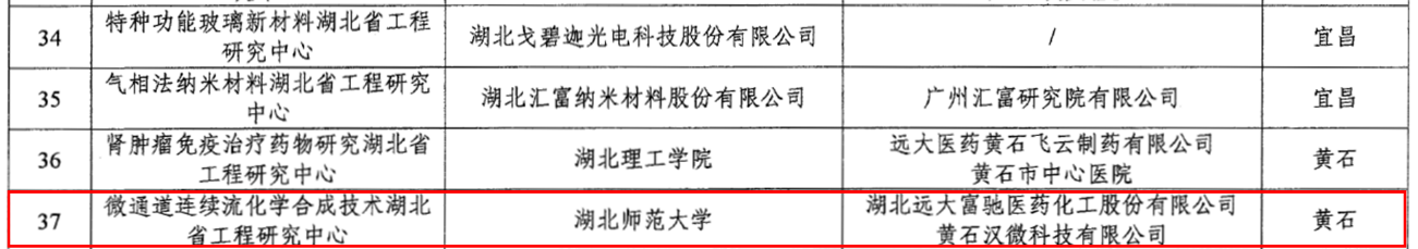 近日,湖北省发展和改革委员会印发《关于公布2024年湖北省工程研究中心认定名单的通知》(鄂发改高技〔2024〕357号),公司作为主要依托单位,与湖北远大富驰医药化工股份有限公司、黄石汉微科技有限公司联合申报的“微通道连续流化学合成技术湖北省工程研究中心”正式获批建设。