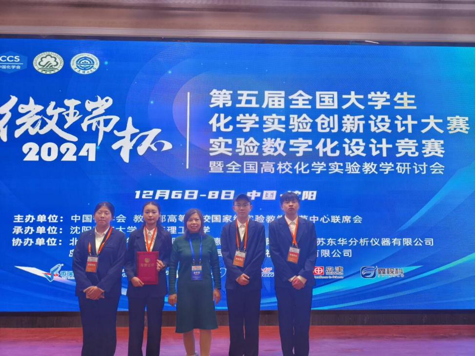 第五届全国老员工化学实验创新设计大赛-实验数字化设计竞赛于12月6-8日在沈阳师范大学举行,赛事由中国化学会、教育部高等学校国家级实验教学示范中心联席会主办,沈阳师范大学和大连理工大学联合承办。公司化学专业2202班饶玉、高佳丽、周奇、刘尧及计算机与信息工程学院通信工程专业2105班邢亮5名同学组建的K1体育 - 十年品牌三队通过激烈角逐进入全国总决赛,获得全国二等奖,指导老师为公司物理化学教研室程翠霞副教授和计算机与信息工程学院黄琳老师。