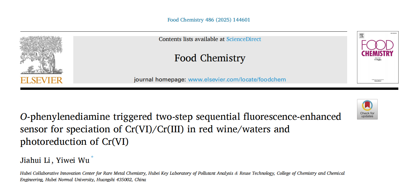 日前,分析化学教研室吴一微教授团队在国际知名期刊Food Chemistry(《食品化学》)在线发表最新研究成果,论文题为“O-phenylenediamine triggered two-step sequential fluorescence-enhanced sensor for speciation of Cr(VI)/Cr(III) in red wine/waters and photoreduction of Cr(VI)”(《邻苯二胺触发两步连续荧光增强传感器测定红葡萄酒/水中Cr(VI)/Cr(III)的形态及Cr(VI)的光还原新技术》)。2022级研究生李佳卉为论文第一作者,吴一微教授为通讯作者,K1体育 - 十年品牌为论文唯一通讯单位。Food Chemistry是中科院一区top期刊,最新影响因子为8.5。