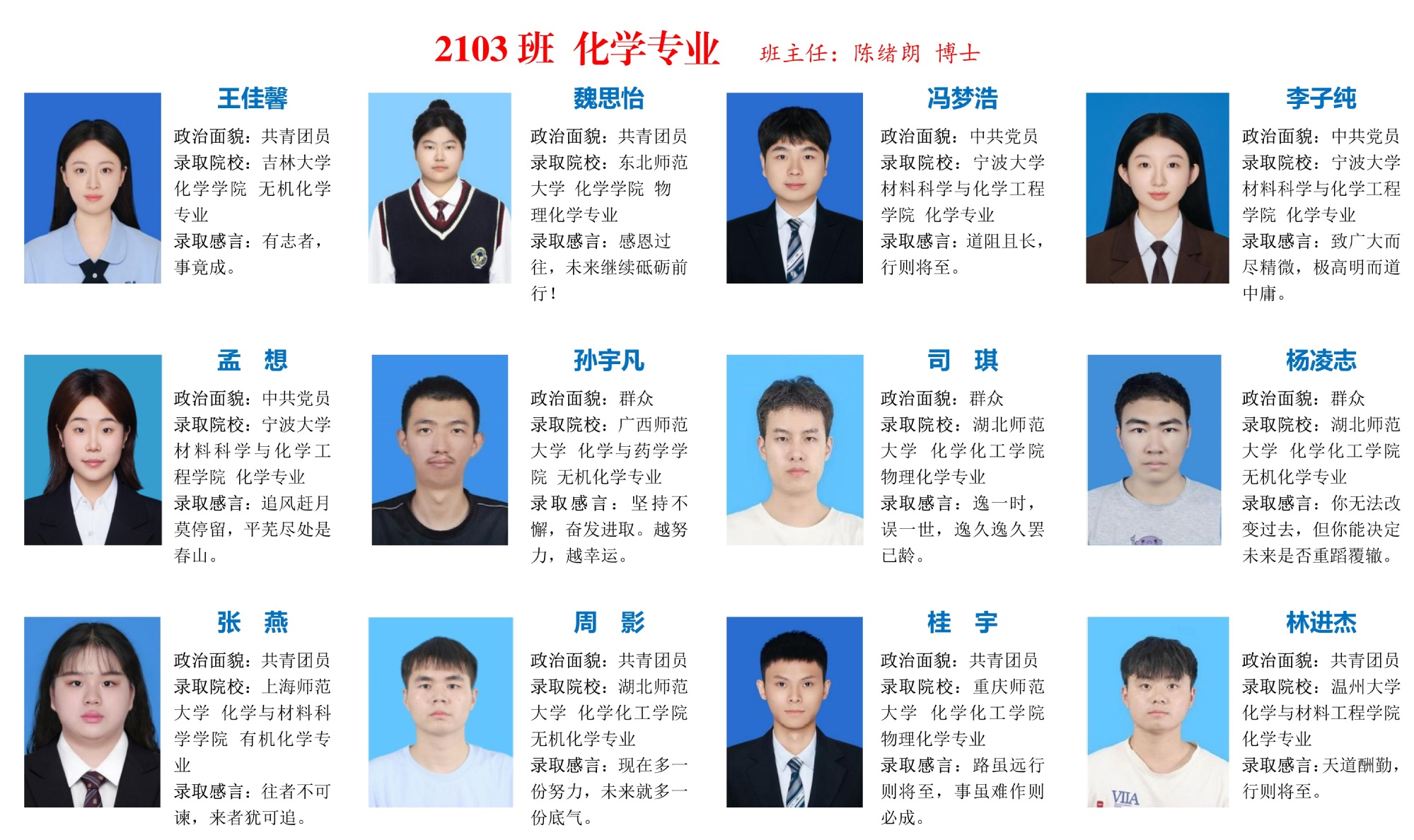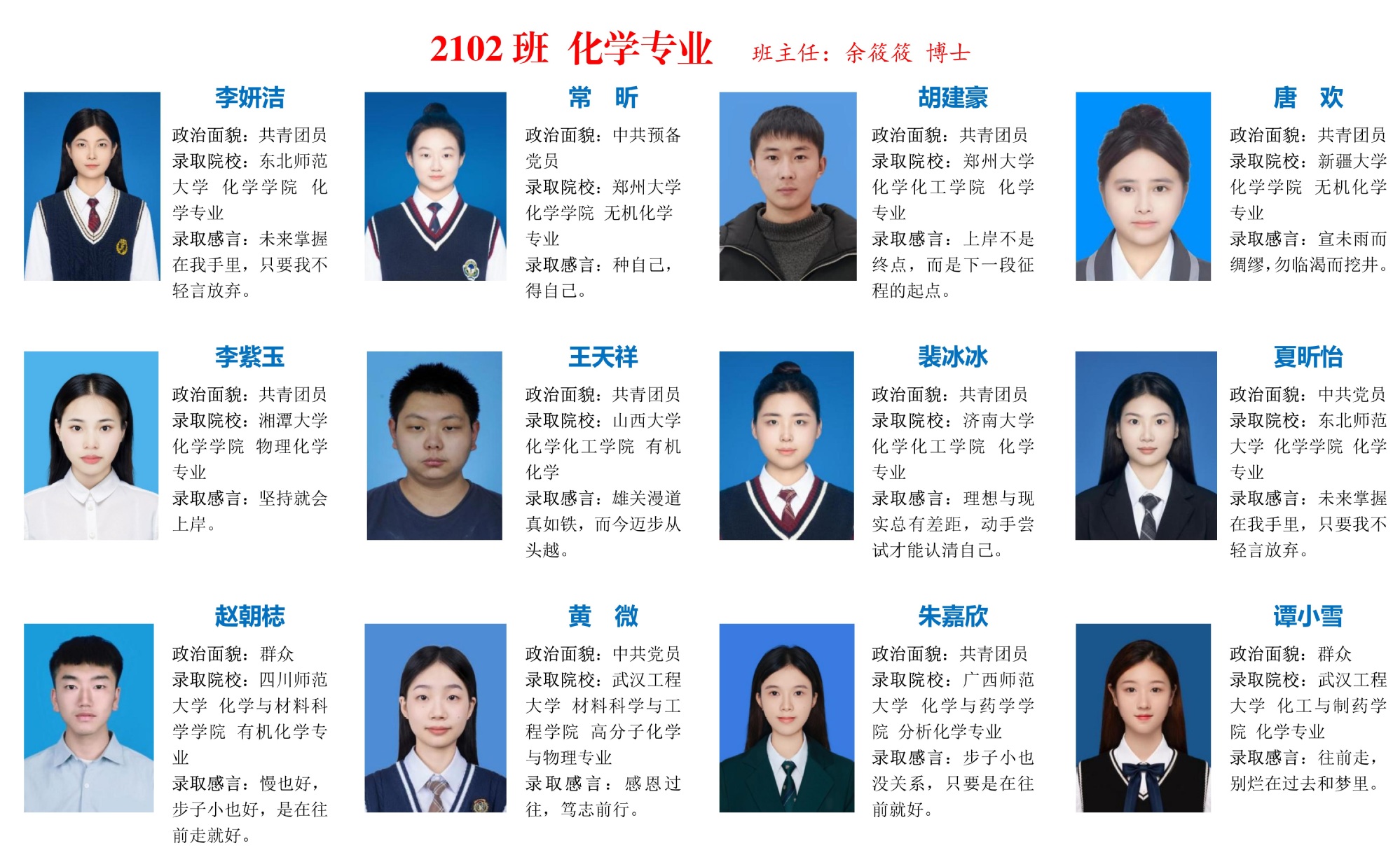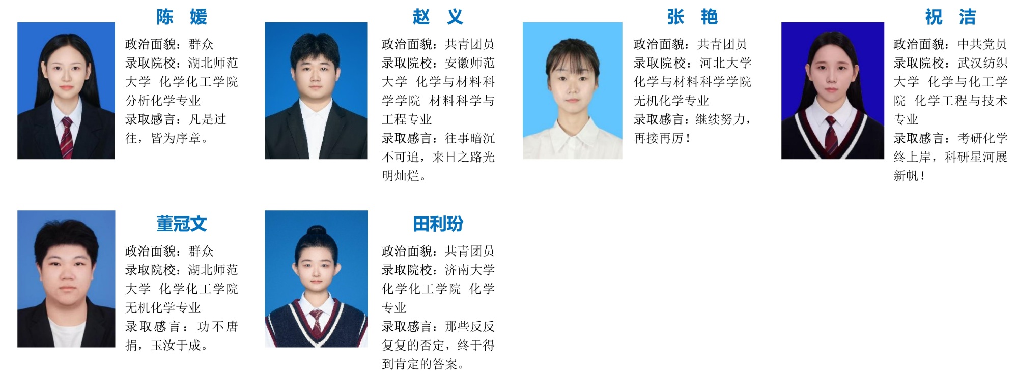 编者按:光不问赶路人,时光不负有心人!在这个充满希望与收获的季节,学院2025届考研学子以坚韧不拔的毅力和勇往直前的决心,在考研战场上披荆斩棘,斩获佳绩!公司2025届本科生被国内各高校、科研院所共录取108人,占毕业生总数(优师计划除外)的40.60%,连续两年考研录取率超过40%。本期推送化学专业考研光荣榜,他们挑灯夜战、攻坚克难,将无数个日夜的汗水凝结成通往梦想的阶梯。