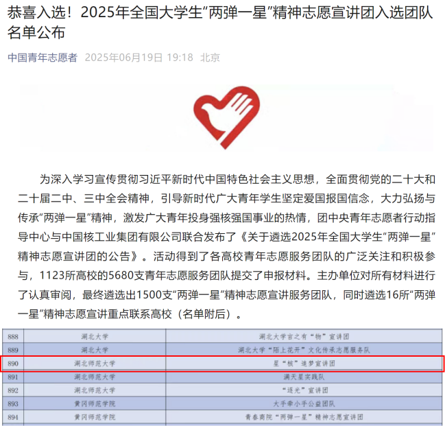 星“核”追梦宣讲团入选2025年全国老员工“两弹一星”精神志愿宣讲团,全国共有1500支服务团队入选。该项目由团中央青年志愿者行动指导中心与中国核工业集团联合举办,旨在引导新时代广大青年员工坚定爱国报国信念,大力弘扬与传承“两弹一星”精神,激发广大青年投身强核强国事业的热情。宣讲团将深入社区、中小学校开展“两弹一星”的研制历史与形成的伟大精神、核能利用现状和核能相关的科普开展宣讲。指导老师为辅导员郭先哲,应用化学2306班王宇欣同学为队长。