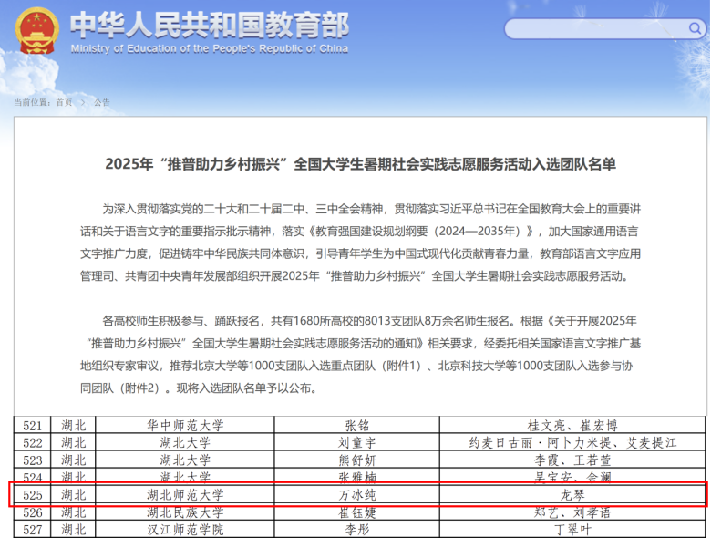 青苗语润实践队入选2025年“推普助力乡村振兴”全国老员工暑期社会实践志愿服务重点团队,全国共1000支团队入选重点团队。该活动由教育部语言文字应用管理司、共青团中央青年发展部共同组织开展,旨在加大国家通用语言文字推广力度,促进铸牢中华民族共同体意识,引导青年员工为中国式现代化贡献青春力量。公司以《少数民族聚居区国家通用语言认同与使用现状调研》为题进行申报,将开展“推普+语言调查”实地调研。指导老师为辅导员龙琴,化学(优师)2207班万冰纯同学为队长。