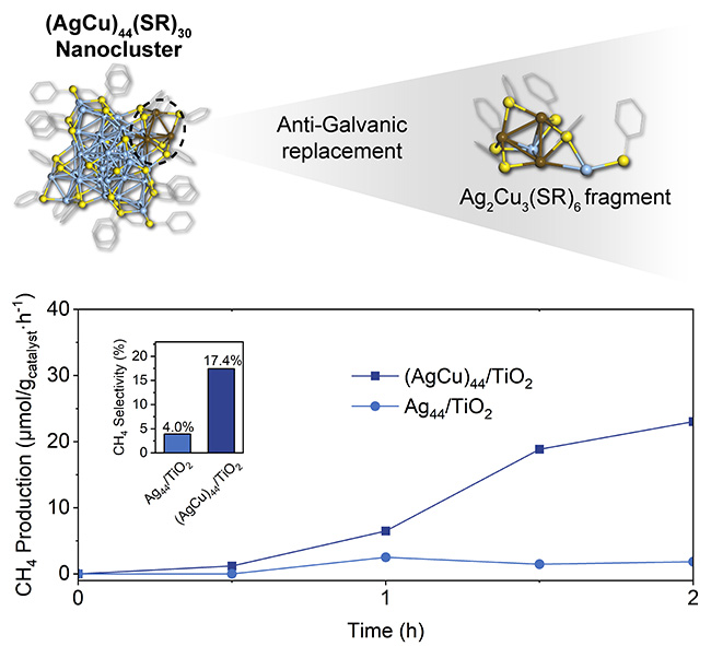 理解双金属催化剂的结构-活性关系对于设计高效催化体系具有重要意义。在该研究中,刘野博士及其所属研究团队成功地在具有原子级精确结构的Ag44纳米簇中引入了多达六个Cu原子。研究发现,在 (AgCu)44结构中,铜原子表现出特定的占位偏好,主要占据在中间层的Ag20十二面体和外层的Ag2(SR)5硫配位单元中。理论与实验研究均表明,Cu原子的引入有利于调控电荷载流子分布,并有效促进载流子在纳米簇内部的空间分离。在光催化 CO2还原反应中,与单一金属组分Ag44纳米团簇敏化的TiO2复合催化剂相比,双金属(AgCu)44纳米团簇敏化的催化剂表现出约两倍的催化活性提升,且对 CH4的选择性提高了约三倍。