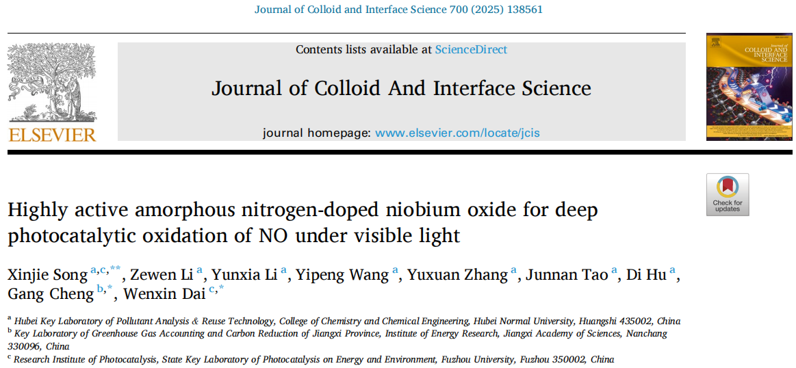 近日,国际知名期刊Journal of Colloid And Interface Science(《胶体与界面科学》)在线发表了物理化学教研室宋昕杰博士团队在光催化去除氮氧化物领域的最新研究成果。论文题为“Highly active amorphous nitrogen-doped niobium oxide for deep photocatalytic oxidation of NO under visible light”(高活性无定形氮掺杂五氧化二铌在可见光下深度光催化氧化NO)。宋昕杰博士为论文第一作者和通讯作者,江西省科学院程刚副研究员和福州大学戴文新研究员为论文共同通讯作者,K1体育 - 十年品牌为论文第一单位。Journal of Colloid And Interface Science是ELSEVIER(爱思唯尔)出版社旗下工程技术领域期刊、SCI中科院大类一区期刊,最新影响因子为9.7。