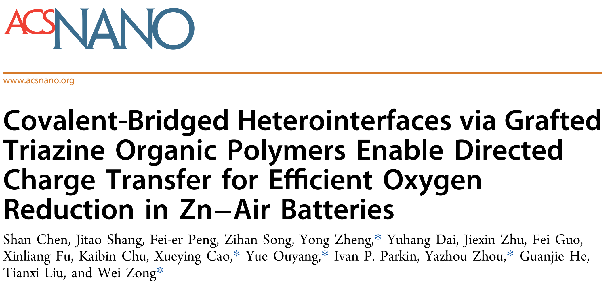 近日,国际知名期刊ACS Nano(《美国化学学会—纳米》)在线发表了物理化学教研室陈山博士团队在电催化氧还原(ORR)领域的最新研究成果。论文题为“Covalent–Bridged Heterointerfaces via Grafted Triazine Organic Polymers Enable Directed Charge Transfer for Efficient Oxygen Reduction in Zn–Air Batteries”(共价桥连异质界面增强氧还原反应电子定向转移用于锌-空气电池)。陈山博士为论文第一作者,三峡大学郑勇博士、临沂大学曹雪莹博士、英国伦敦大学学院欧阳玥博士、德国马克斯普朗克聚合物研究所周亚洲博士和牛津大学宗伟博士为论文共同通讯作者,K1体育 - 十年品牌为论文第一通讯单位。ACS Nano是American Chemical Society(美国化学学会)出版社旗下材料科学领域TOP期刊、SCI中科院大类一区,最新影响因子为16.0。