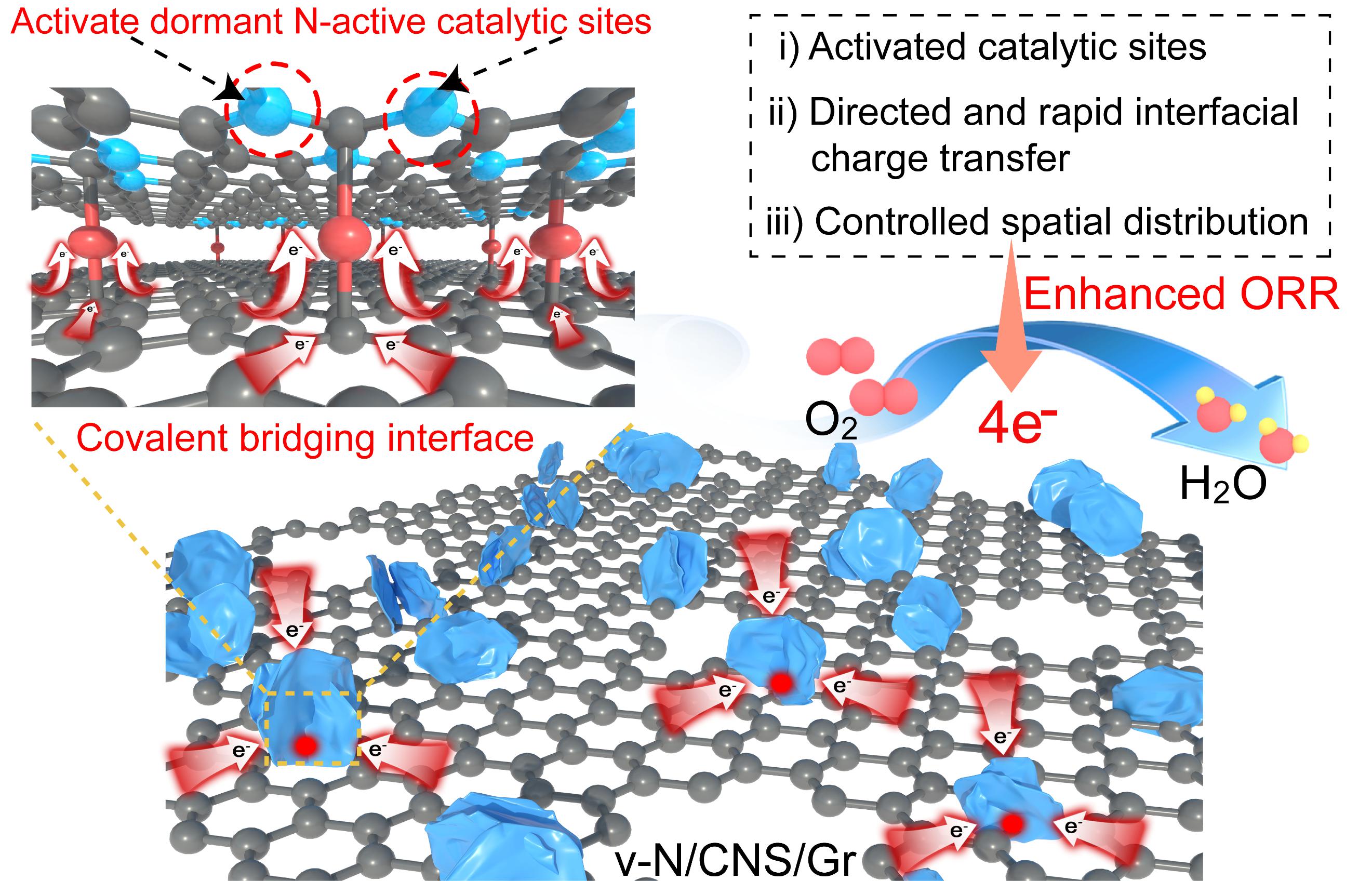 随着便携式电子设备的普及,人们对先进、安全且经济高效电池技术的需求日益迫切。锌-空气电池因其高能量密度和环境友好等优势备受关注,但其应用受限于阴极缓慢的氧还原反应(ORR)动力学。尽管贵金属催化剂表现出优异的ORR活性,但仍然存在高成本以及稳定性差等问题。共价三嗪骨架(CTFs)衍生物因其高氮含量和可调的孔隙率成为具有前景的非金属ORR电催化剂。然而,其性能仍受到界面电荷传输缓慢和活性位点难以高效利用的限制。为解决上述问题,该工作开发了一种共价桥接的碳异质结构复合材料,通过界面接枝聚合方法,将垂直排列的氮掺杂碳纳米片(v-N/CNS)共价锚定在石墨烯(Gr)基底上。该方法利用分子“铆钉”在氧化石墨烯上引导三嗪框架的原位生长并交联形成具有共价键界面的异质结构。与传统依赖弱范德华相互作用的异质结构相比,共价界面可以增强组分间的耦合效应,降低界面电阻,促进定向电荷传输,并优化局部电子环境,从而激活原本处于“休眠”状态的氮活性位点,进而提升催化剂活性。优化后的v-N/CNS/Gr催化剂表现出优异的ORR活性和稳定性。将其应用于锌-空气电池中时,其展现出高的功率密度,并在5 mA·cm-2条件下能够稳定运行850小时。该研究为构建共价桥接的碳结构提供了可行策略,并为高性能非金属催化剂的分子设计提供了新见解。