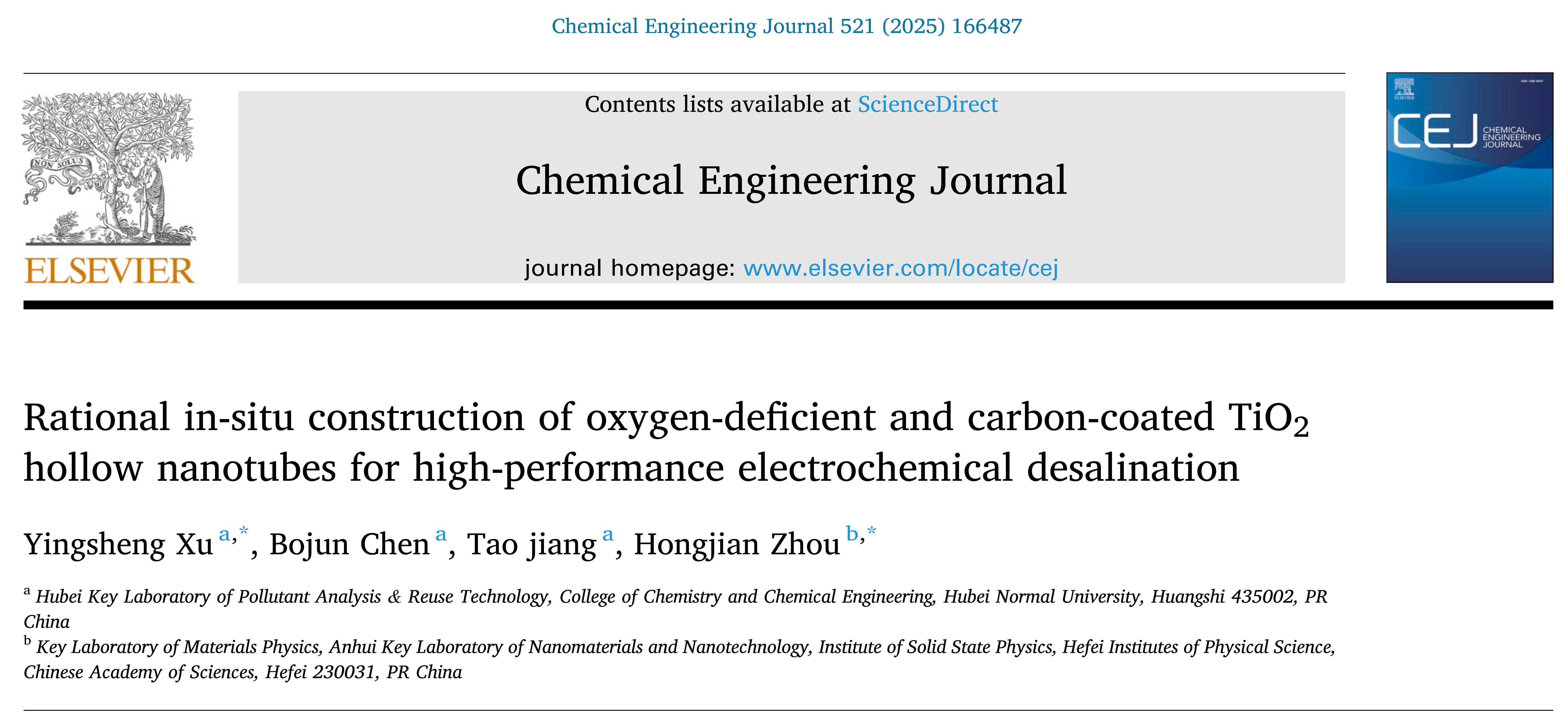 近日,国际知名期刊Chemical Engineering Journal(《化学工程杂志》)在线发表了物理化学教研室徐应生博士团队在电化学脱盐领域的最新研究成果。论文题为“Rational in-situ construction of oxygen-deficient and carbon-coated TiO2 hollow nanotubes for high-performance electrochemical desalination”(《原位构筑高性能碳包覆氧空位TiO2中空纳米管电极用于高效脱盐》)。徐应生博士为论文第一作者兼通讯作者,中科院合肥物质研究院周宏建研究员为论文共同通讯作者,实验与数据处理部分由课题组2022级本科生陈伯骏(论文第二作者)完成,K1体育 - 十年品牌为论文第一通讯单位。Chemical Engineering Journal是ELSEVIER(爱思唯尔)出版社旗下材料科学领域TOP期刊、SCI中科院大类一区,最新影响因子为13.2。