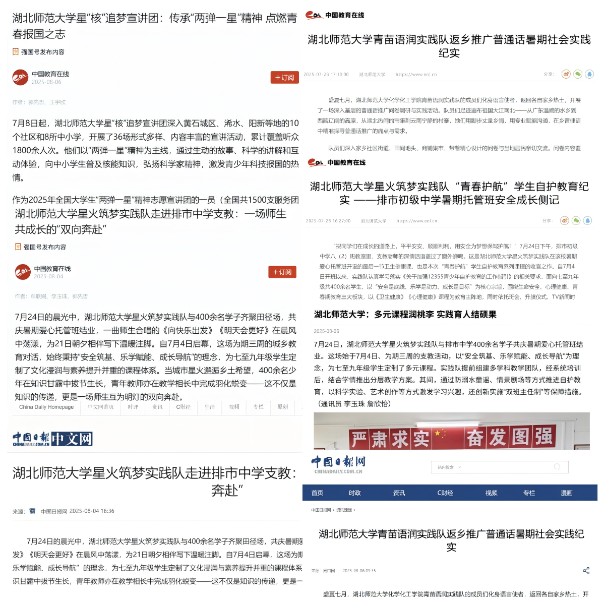 深耕教育实践,以多元活动助力师范生成长。课堂教学、班级管理、谈心谈话和教学研究等员工走上教师岗位的必备能力,在暑期实践的实战场景中得到集中锤炼与提升。星火筑梦实践队前往阳新县排市中学开展为期三周的支教,为七至九年级员工制定了“基础巩固+兴趣拓展+自护教育”的三维课程体系,员工收获了知识与梦想,队员也完成教育成长蜕变,成就了一场师生共成长的“双向奔赴”。“来的时候想改变他们,走的时候才发现被改变的是我们自己”一队员离开时在朋友圈里写到。向阳花护航队8名队员走进黄石石料山社区开展了为期三周的暑假爱心托管班,为孩子们提供作业辅导、安全教育、知识科普和益智活动等服务,家长点赞“比培训班更走心”。追梦实践队和青衿致远实践队分别围绕高中化学教材和科普读物中科学家精神的呈现效果评估和乡镇中小学员工普通话使用情况展开教学研究,有效提升其文献查阅、发现问题的能力。