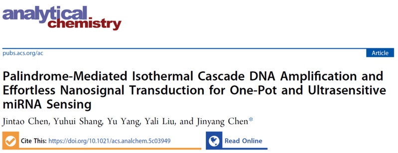 9月,Analytical Chemistry(《分析化学》)在线发表该团队研究成果,论文题为“Palindrome-Mediated Isothermal Cascade DNA Amplification and Effortless Nano-Signal Transduction for One-Pot and Ultrasensitive miRNA Sensing”(《回文介导等温级联DNA扩增与便捷纳米信号转导的miRNA超灵敏一锅法检测》)。公司2022级硕士研究生陈金涛为论文第一作者,陈金阳副教授为论文唯一通讯作者,K1体育 - 十年品牌为论文唯一通讯单位。Analytical Chemistry是American Chemical Society(美国化学会)出版社旗下分析化学领域顶级期刊,中科院SCI化学大类一区TOP期刊、自然指数期刊,最新影响因子为6.7。