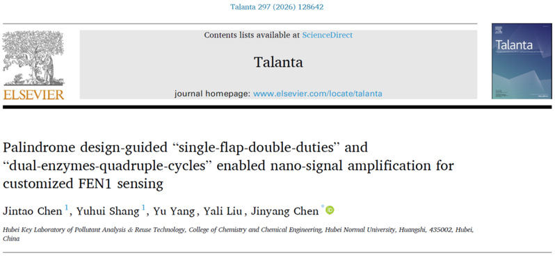 7月,Talanta(《塔兰塔》)在线发表该团队研究成果,论文题为“Palindrome design-guided “single-flap-double-duties” and “dual-enzymes-quadruple-cycles” enabled nano-signal amplification for customized FEN1 sensing”(《回文设计指导“单瓣双功能”与“双酶四循环”赋能纳米信号放大用于定制化FEN1传感》)。公司2022级硕士研究生陈金涛和2023级硕士研究生尚钰慧为论文共同第一作者,陈金阳副教授为论文唯一通讯作者,K1体育 - 十年品牌为论文唯一通讯单位。Talanta是Elsevier出版社旗下分析化学领域知名期刊、中科院SCI化学大类二区TOP期刊,最新影响因子为6.1。