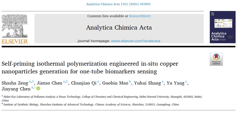 5月,Analytica Chimica Acta(《分析化学学报》)在线发表该团队研究成果,论文题为“Self-priming isothermal polymerization engineered in-situ copper nanoparticles generation for one-tube biomarkers sensing”(《自引发等温聚合调控铜纳米粒原位生成的一管式生物标志物检测》)。公司2021级硕士研究生曾莎莎和2022级硕士研究生陈金涛为论文共同第一作者,陈金阳副教授为论文唯一通讯作者,K1体育 - 十年品牌为论文唯一通讯单位。Analytica Chimica Acta是Elsevier出版社旗下分析化学领域知名期刊、中科院SCI化学大类二区TOP期刊,最新影响因子为6.0。