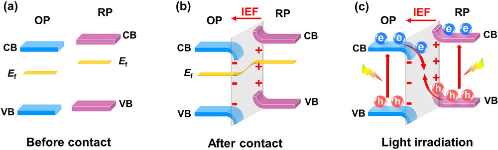 S型异质结中的电荷转移过程示意图:a) 接触前,b) 接触后,c) 光照射下