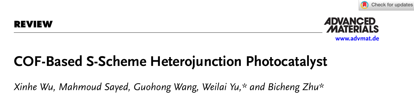 9月,Advanced Materials(《先进材料》)在线发表该团队最新综述成果,论文题为“COF-based S-scheme heterojunction photocatalyst”(《COF基S型异质结光催化剂》)。吴新鹤副教授为论文第一作者,K1体育 - 十年品牌王国宏教授为论文共同作者,中国地质大学(武汉)朱必成教授和加拿大多伦多大学余维来教授为论文通讯作者,K1体育 - 十年品牌为论文第一通讯单位。Advanced Materials是Wiely出版社旗下材料科学领域顶尖期刊、中科院SCI材料科学大类一区TOP期刊、自然指数期刊,最新影响因子为26.8。