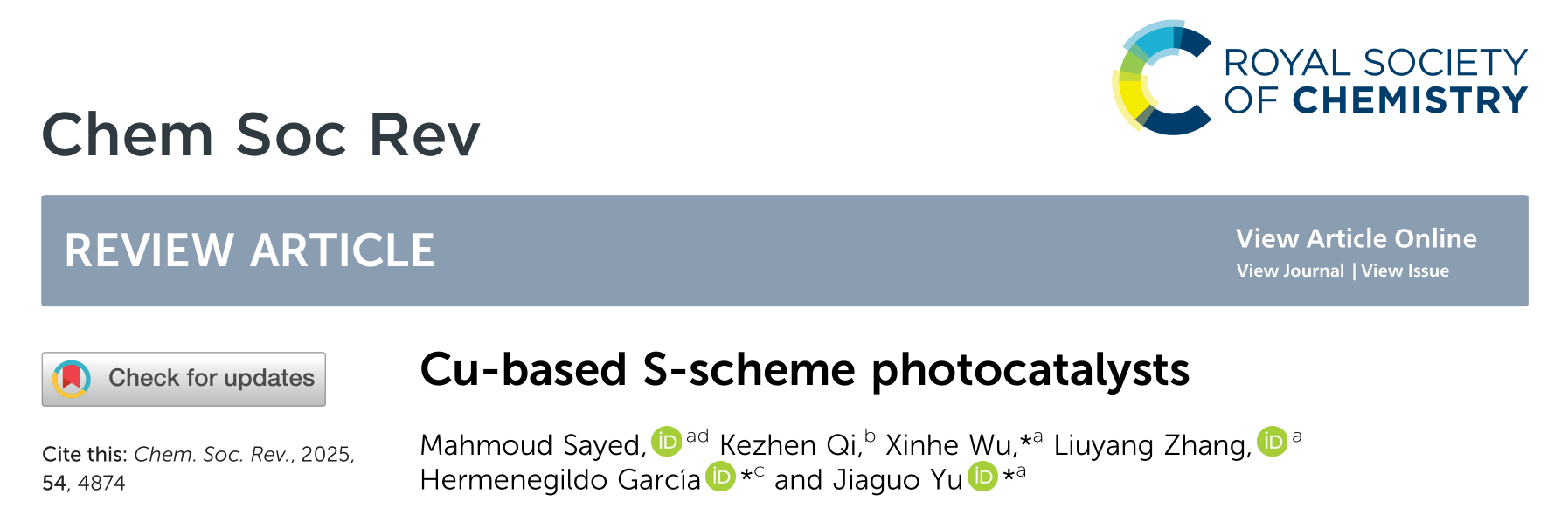 5月,化学领域顶级综述期刊Chemical Society Reviews(《化学学会评论》)在线发表该团队成果,论文题为“Cu-based S-scheme photocatalysts”(《Cu基S型光催化剂》)。吴新鹤副教授为论文第一通讯作者,瓦伦西亚理工大学Hermenegildo García教授、中国地质大学余家国教授为论文共同通讯作者。Chemical Society Reviews是英国皇家化学学会出版的化学类国际学术期刊、中科院SCI化学大类一区TOP期刊、自然指数期刊,最新影响因子为39。
