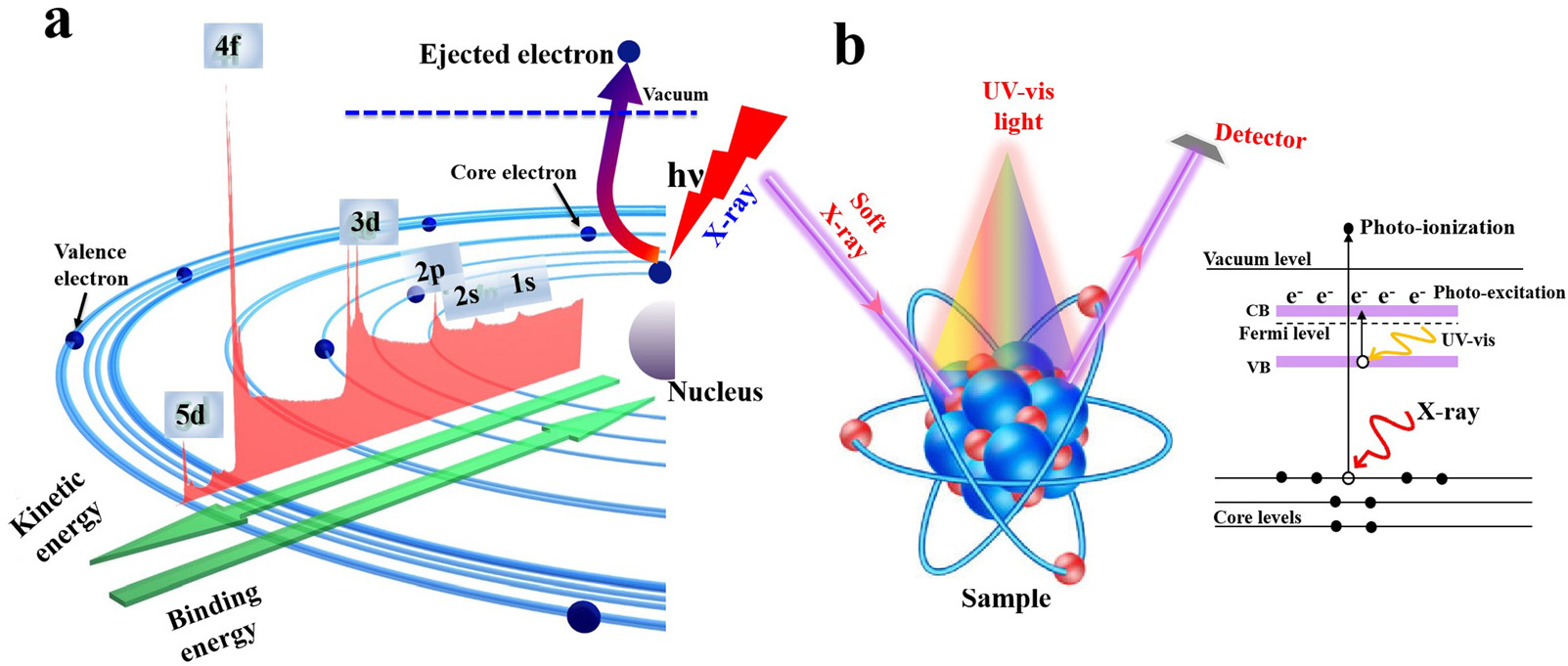 a) XPS工作原理和 b)原位XPS测试原理示意图