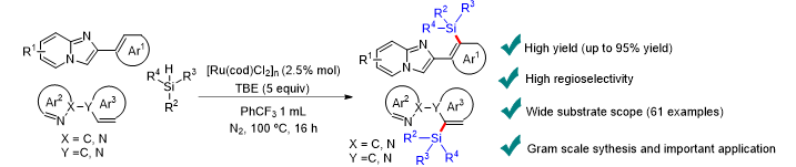 导向C-H键活化凭借其优异的原子经济性和区域选择性,已成为备受关注的合成策略。近年来,咪唑并吡啶作为一种具有特殊结构的“明星”药物分子得到广泛研究,但由于该杂环存在多个活性位点,因此如何实现某个C-H键的精准“切割”成为一个亟需解决的难题。该论文报道了一种钌催化导向C(sp2)-H键活化实现硅基化的方法。该反应利用吡啶和咪唑吡啶作为导向基团,以氢硅烷为硅烷化试剂,可直接实现2-芳基咪唑并吡啶芳环的邻位硅基化。该方法无需任何预活化步骤即可实现区域选择性的C(sp2)-H键硅基化,并以优异的产率获得相应的产品。值得注意的是,这是首例通过形成五元环金属中间体,实现氢硅烷与咪唑并[1,2-a]吡啶耦合的报道。该合成方案具有良好的可放大性,且适用于多种2-芳基含氮杂环化合物。在基于系列机理实验研究的基础上提出了一种可能的催化循环机制。后续的衍生化反应进一步证明了产物在合成中的应用价值。此外,在NCM811||锂金属电池的长期循环测试中,将该硅烷化产物用作电解质添加剂,可显著提升正极-电解质界面的稳定性。