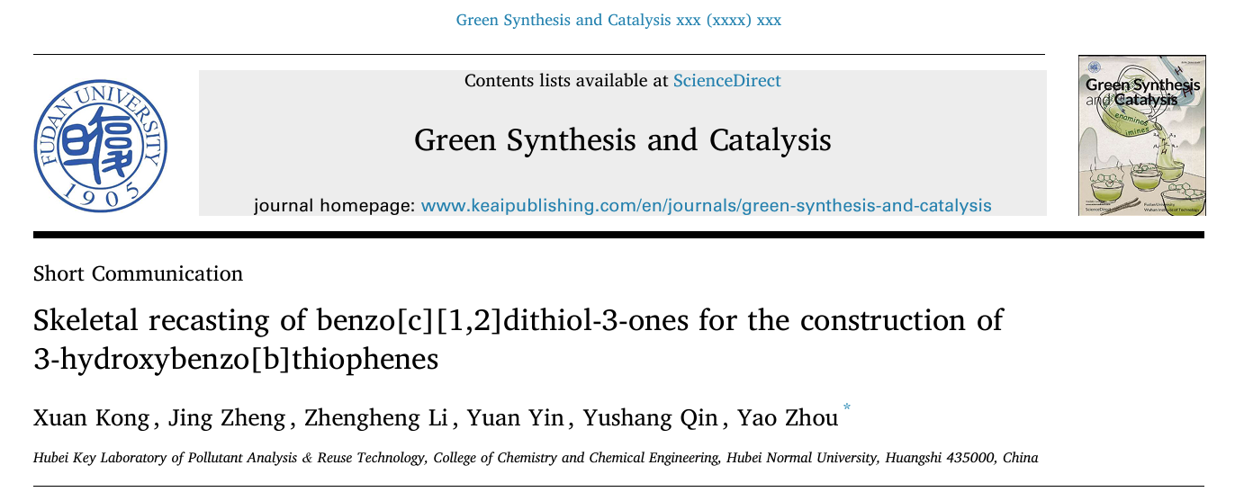 该成果于2025年8月发表于中科院SCI大类一区Green Synthesis and Catalysis(IF:6.3),2023级硕士研究生孔暄为论文第一作者,周耀副教授为论文通讯作者,K1体育 - 十年品牌为论文唯一通讯单位。