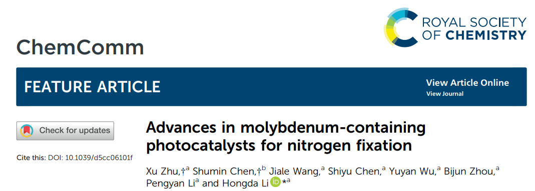 2025年12月,Chemical Communications(《化学通讯》)在线发表了该团队在光催化固氮领域的研究综述,论文题为“Advances in Molybdenum-Containing Photocatalysts for Nitrogen Fixation”(含Mo光催化固氮催化材料的研究进展)。李宏达博士为论文唯一通讯作者,K1体育 - 十年品牌为论文第一通讯单位,应用化学专业2305班本科生朱旭与荆楚理工学院陈淑敏教授为论文共同第一作者。Chemical Communications是自然指数期刊、中科院二区TOP期刊,最新影响因子为4.2。