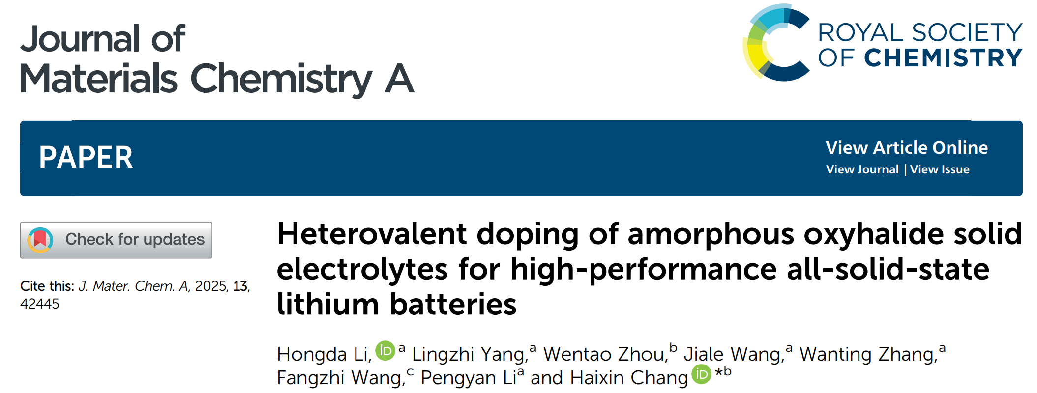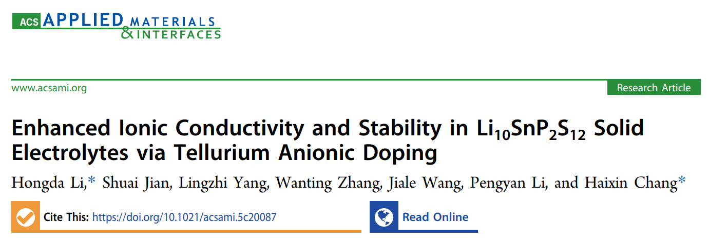 2025年11-12月,ACS Applied Materials & Interfaces(美国化学会《应用材料与界面》)和Journal of Materials Chemistry A(《材料化学A》)分别在线发表了该团队题为“Enhanced Ionic Conductivity and Stability in Li10SnP2S12 Solid Electrolytes via Tellurium Anionic Doping”(碲阴离子掺杂提高Li10SnP2S12固态电解质的离子导电率和稳定性)和“Heterovalent doping of amorphous oxyhalide solid electrolytes for high-performance all-solid-state lithium batteries”(异价掺杂无定形氧卤化物固体电解质用于高性能全固态锂电池)的研究论文。李宏达博士分别为论文第一/通讯作者和第一作者,K1体育 - 十年品牌均为论文第一通讯单位;华中科技大学常海欣教授分别为论文的共同通讯作者和唯一通讯作者。ACS Applied Materials & Interfaces是中科院二区TOP期刊,最新影响因子为8.2;Journal of Materials Chemistry A是中科院二区TOP期刊,最新影响因子为9.5。