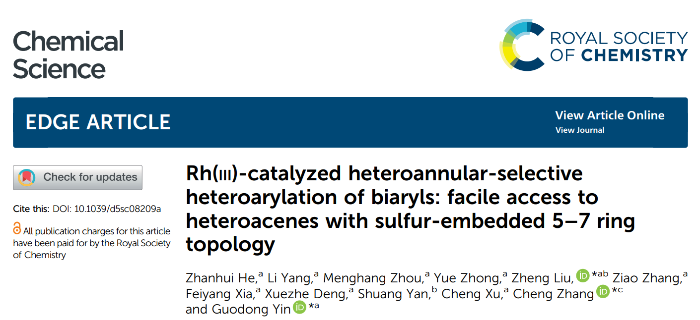 今年元月,Chemical Science(《化学科学》)在线发表该团队题为“Rh(III)-Catalyzed heteroannular-selective heteroarylation of biaryls: facile access to heteroacenes with sulfur-embedded 5-7 ring topology”(铑(III)催化联芳烃异环选择性杂芳基化反应:快速构筑具有硫原子嵌入5-7环拓扑结构的稠环芳烃)的研究论文。公司2023级硕士研究生何展辉为论文第一作者,殷国栋教授、刘郑副教授和四川大学张程研究员为通讯作者,K1体育 - 十年品牌为第一通讯单位。Chemical Science是2010年由Royal Society of Chemistry(英国皇家化学会)出版社发行的化学领域综合性期刊,是中科院一区TOP期刊、自然指数(Nature Index)期刊,最新影响因子为7.5。