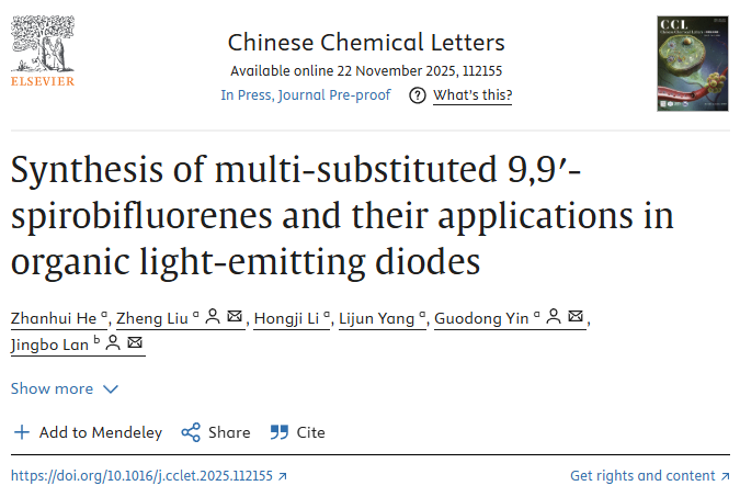 去年11月,Chinese Chemical Letters(《中国化学快报》)在线发表该团队题为“Synthesis of multi-substituted 9,9'-spirobifluorenes and their applications in organic light-emitting diodes”(多取代9,9'-螺二芴骨架的合成及其在有机发光二极管中的应用)的综述论文。公司2023级硕士研究生何展辉为论文第一作者,殷国栋教授、刘郑副教授和四川大学兰静波教授为通讯作者,K1体育 - 十年品牌为第一通讯单位。Chinese Chemical Letters是1990年由中国化学会主办,中国医学科学院药物研究所承办的化学综合领域期刊,是中科院一区TOP期刊,最新影响因子为8.9。
