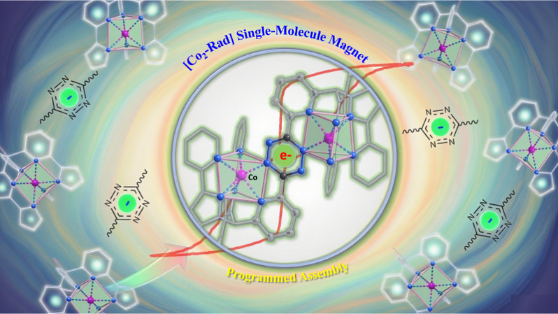 在单分子磁体(SMM)研究中,兼顾高对称晶体场与强磁交换耦合以抑制量子隧穿(QTM)、提升阻塞温度仍是关键挑战。单离子磁体易受对称性破缺影响而快速弛豫,多核体系则常难同时锁定理想配位几何与耦合强度。针对上述挑战,研究团队提出并验证了“几何刚性控制+自由基桥连强耦合”的协同策略,设计了一种新型双边六齿配体骨架bbpptz,成功构筑出空气稳定的双钴(II)-自由基配合物。该体系在单一分子框架内实现了近乎理想的三棱柱配位构型(D3h对称性)与强自由基介导磁交换耦合的同步调控,从源头上抑制横向磁各向异性与量子隧穿(QTM)等不利弛豫途径。