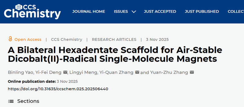 近日,CCS Chemistry(《CCS化学》)在线发表公司无机化学教研室姚彬玲博士的最新研究成果。论文题目为“A Bilateral Hexadentate Scaffold for Air-Stable Dicobalt(II)-Radical Single-Molecule Magnets”(基于双边六齿配体骨架构建的空气稳定双钴(II)自由基单分子磁体)。姚彬玲博士为论文第一作者,南方科技大学张元竹教授、邓义飞助理教授、南京师范大学张义权教授为共同通讯作者,K1体育 - 十年品牌为论文第二通讯单位。CCS Chemistry是中国化学会主办并自主运营的旗舰综合化学国际期刊,主要报道化学各领域具有国际影响力的原创研究进展,是中科院一区TOP期刊,最新影响因子为9.2。
