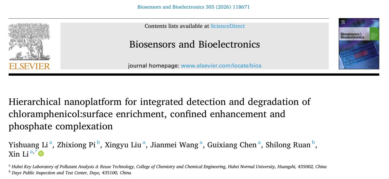 4月,Biosensors and Bioelectronics(《生物传感器和生物电子学》)发表了该团队又一研究成果。论文题为“Hierarchical nanoplatform for integrated detection and detoxification of chloramphenicol:surface enrichment, confined enhancement and phosphate complexation”(表面富集、限域增强与磷酸盐络合的氯霉素检测与降解一体化分级纳米平台)。公司2022级硕士研究生李艺爽为论文第一作者,李新副教授为通讯作者,K1体育 - 十年品牌为唯一通讯单位。Biosensors and Bioelectronics是ELSEVIER出版社旗下国际知名期刊,SCI中科院大类一区,最新影响因子为10.5。